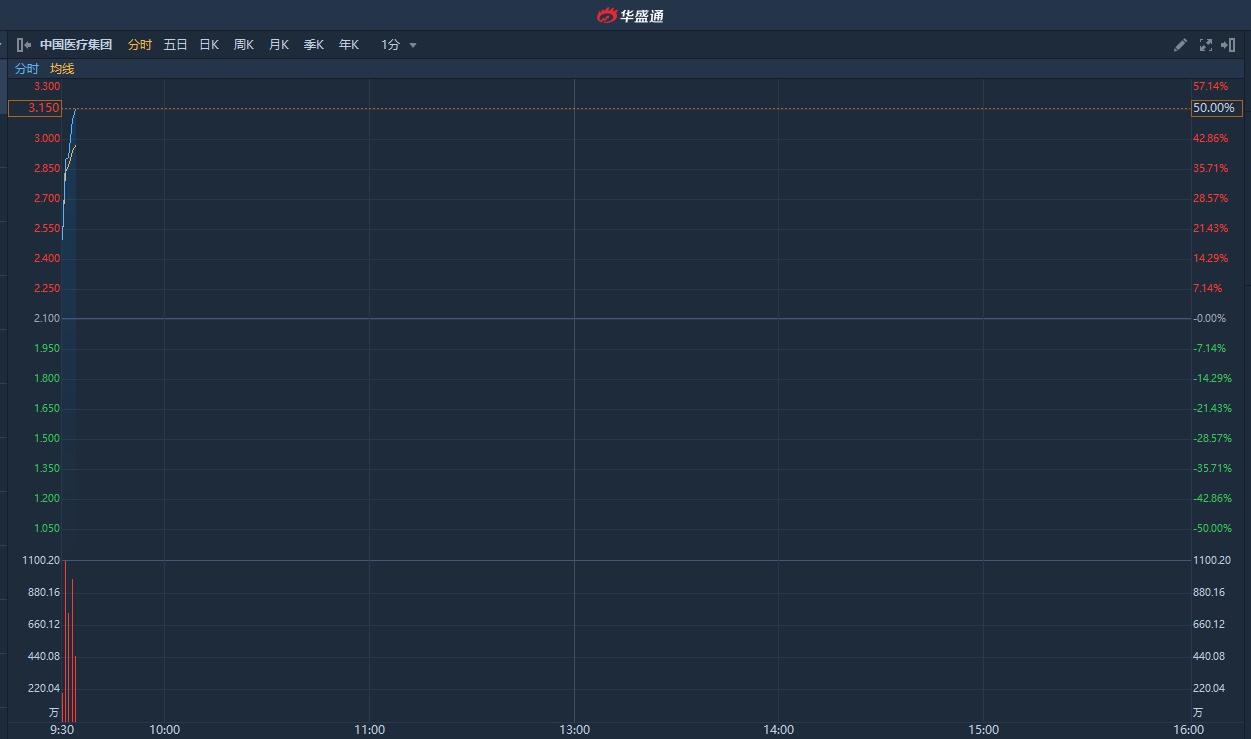 智通财经APP获悉,创业板中国医疗集团(08225)近日遭资金爆炒,股价三连阳,累积涨幅超20倍。截止发稿,涨50%,报3.15港元,成交额9126.24万港元。
