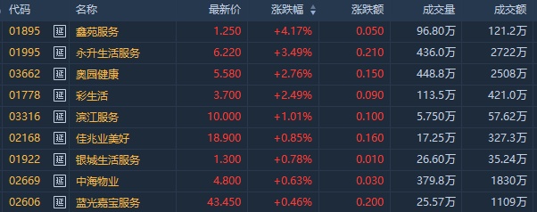 智通财经APP获悉,野村发表研究报告指,物业管理的费用维持稳定,在短期内仍看好物业管理相关股份。部分物业股逆市上扬。截止发稿,永升生活服务(01995)涨3.99%,报6.25港元;奥园健康(03662)涨2.95%,报5.59港元;鑫苑服务(01895)涨2.5%,报1.23港元;彩生活(01778)涨2.49%,报3.7港元。