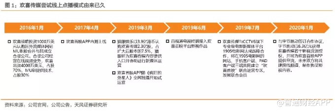 欢喜传媒自建欢喜首映平台,尝试线上点播模式由来已久。欢喜传媒2016年战略投资1000万美元认购国外流媒体网站MUBI股份并成立合资公司经营在线视频业务,MUBI为创立于土耳其的在线电影网站,主打独立电影的视频点播服务,有独立电影界Netflix之称。2017年欢喜首映APP内测上线,2019年3月,猫眼娱乐与欢喜传媒达成合作,猫眼为欢喜传媒内容提供入口并协助其新媒体运营,同月欢喜首映APP随《疯狂的外星人》全网独播开始试运营,随后欢喜首映陆续和百视通、CCTV6旗下专业级电影新媒体平台1905电影网达成战略合作。