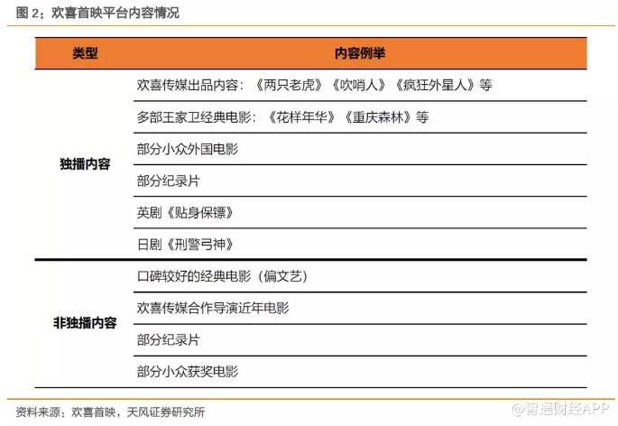 欢喜首映平台内容分为独家内容和非独家内容两类。独家内容主要是欢喜传媒主出品或合作导演拍摄电影,如《疯狂的外星人》、王家卫经典电影《花样年华》等,另外有部分外采内容,包括部分小众外国电影、纪录片,以及英剧《贴身保镖》和日剧《刑警弓神》等。非独播内容则为部分欢喜传媒合作导演近年电影作品及外购的经典电影等。