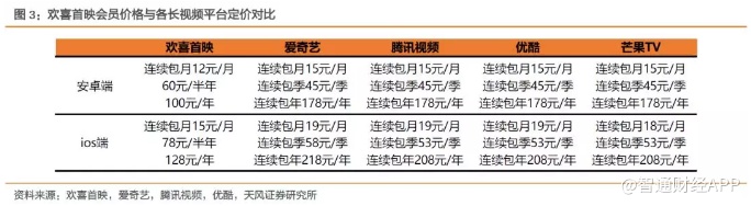 除少部分限时免费外,欢喜首映平台内几乎每部影片都需要开通会员观看。从会员定价看,由于欢喜首映内容库比几大视频网站小,因而定价也相对较低,欢喜首映会员价格安卓端最低8.3元/月,iOS端最低10.7元/月,而几大视频网站中安卓端最低为14.8元/月,iOS端最低为17.3元/月。