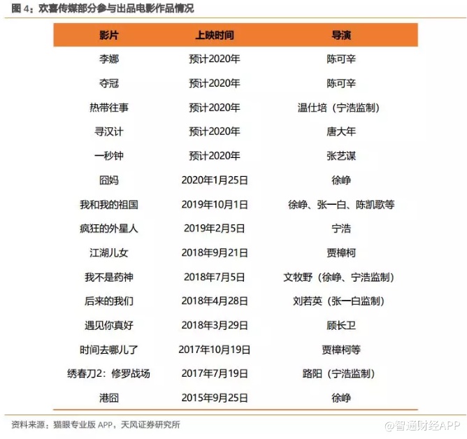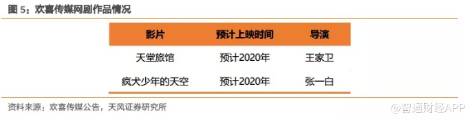 欢喜传媒电影/电视剧产量较小同时难以负担较大体量的内容支出,因而欢喜首映平台影响力并不突出。2015年至今欢喜传媒上映电影作品约10部(包括《囧妈》)。2020年开始公司影视剧作品上线预计加速,当前储备电影项目包括张艺谋导演《一秒钟》、陈可辛导演《李娜》《夺冠》等5部,网剧作品包括王家卫导演《天堂旅馆》、张一白导演《疯犬少年的天空》等。