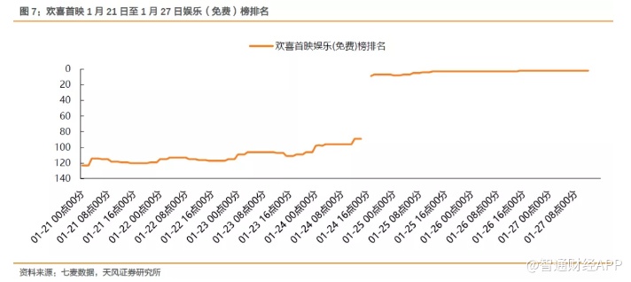 其次,据欢喜传媒2019年中报披露数据,欢喜首映付费用户数超过100万,相比各大视频网站付费用户数而言差距较大。而通过此次事件的推动,欢喜首映APP下载量明显提升,1月24日前欢喜首映APP在娱乐(免费)榜中维持在100名后,1月25日迅速冲进榜单前3。