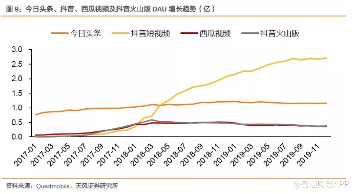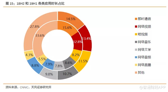 长视频为用户使用时长占比仅次于即时通信的娱乐形式,字节跳动切入长视频领域有利于其产品总用户时长进一步增长。根据CNNIC数据,2019年上半年在线视频类APP用户使用时长占比环比扩大0.6pct至13.4%,占比仅次于即时通信,且差距缩小。