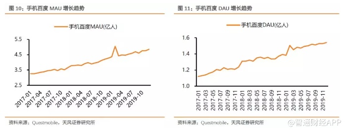 2019年百度(BIDU.US)作为央视《春节联欢晚会》独家网络互动平台,参与2019年的春晚红包互动,活动期间为1月28日(小年)至2月4日(除夕),共8天,红包总额高达10亿。10亿红包直接拉动百度用户数据增长,百度2019年2月MUA和DAU分别相对1月增长6800万和1200万至5.05亿和1.51亿,而2018年全年百度MAU和DAU净增量也仅6200万和1600万。