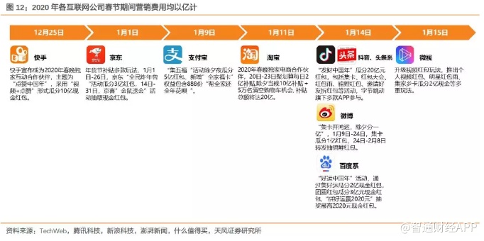 2020年春节前各互联网公司先后发布红包方案,其中快手(KWAI.US)(10亿红包)和淘宝成为春晚独家互动合作伙伴和独家电商合作伙伴,另外,京东(JD.US)、支付宝、头条系、百度系、微视等也有相应的红包玩法,红包总金额均以亿计。