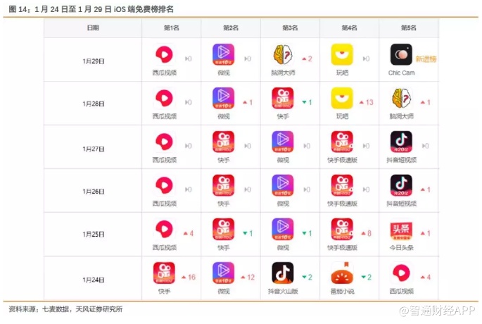 但1月24日字节跳动与欢喜传媒宣布合作后,西瓜视频在iOS免费榜迅速超过快手排名第一,并且自1月25日至今(1月29日)西瓜视频持续位列免费榜第一,快手仅居第二(1月28日后快手排名进一步下滑)。可见,字节跳动通过与欢喜传媒的合作实现了又快又准的反击。