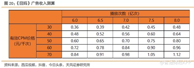 以大年初一免费播出的《囧妈》为例,根据凤凰网报道,截止1月27日《囧妈》在头条系四大平台(抖音、西瓜视频、今日头条、抖音火山版)及智能电视鲜时光总播放量超过6亿,《囧妈》片头仅两段15秒海澜之家贴片广告和字节跳动公益广告,另外用户打开APP时有一段开屏广告,假设平均CPM价格为50元/千次,总计播放次数7亿次,每个用户浏览2条广告(开屏广告和贴片广告),则《囧妈》广告收入仅7000万元。就算考虑后续持续播放量,广告收入体量也在1-2亿水平。