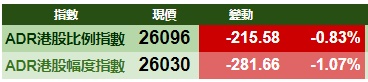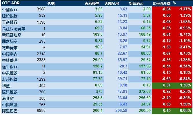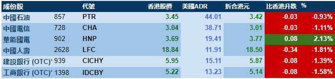 智通财经APP获悉,周五(1月31日),美股全线重挫,连累港股ADR指数下挫,按比例计算,收报26096点,跌215.58点或0.83%。大型蓝筹均小幅下跌,汇丰控股收报56.37港元,较港收市跌0.48港元;腾讯控股收报372.08港元,较港收市跌0.92港元。内银股靠稳,建设银行收报5.87港元,较港收市跌0.08港元;工商银行收报5.14港元,较港收市跌0.08港元。