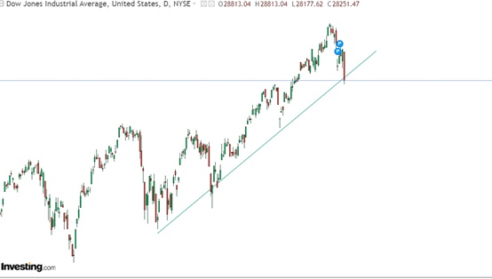 道指曾一度突破29000点,但是近日开始回落至上升轨附近,读者必须留意会否出现反弹。