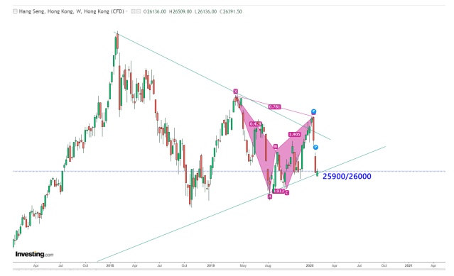 恒生指数方面,目前下跌,那当前必须要留意25900/26000点关口,一旦跌穿有机会挑战24800/22000点。但留意2月的周期,及2月4日的江恩转势日,或者有机会在下跌之前作一个反弹。