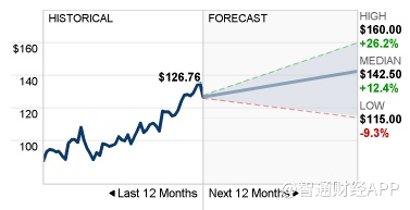 从股价来看,在接受调查的24位分析师中,普遍预计公司在未来12个月内的预估中值为142.5美元,最高160美元,最低115美元。该预估中值较上次的126.86美元上升了12.33%。