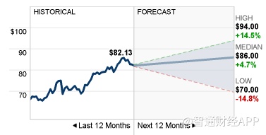 从股价来看,在接受调查的11位分析师中,普遍预计公司在未来12个月内的预估中值为86美元,最高94美元,最低70美元。该预估中值较上次的82.13美元上升了4.7%。