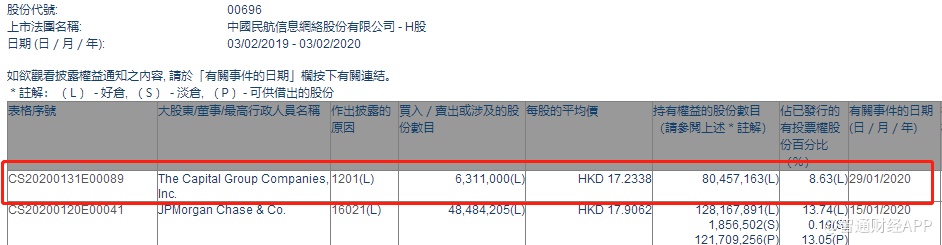 智通财经APP获悉,联交所最新资料显示,1月29日,The Capital Group减持中国民航信息网络(00696)631.1万股,每股作价17.2338港元,总金额约为1.09亿港元,减持后最新持股数目约为8045.72万股,最新持股比例为8.63%。