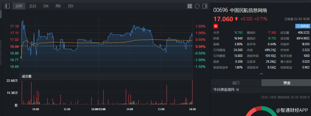 截至今日收盘,中国民航信息网络(00696)涨0.71%,报17.06港元。