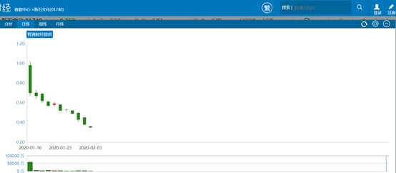 然而正是这支高调亮相的新股,正式登场之后却是一路萎靡不振。1月16日,新石文化0.98港元开盘假较发行价近乎翻倍,在短暂冲出1.02港元高点后便直线下滑,最终收盘为0.7港元,虽然较发行价上涨40%,但是离高开价格下行了28.57%。此后截止到2月3日收盘的10个交易日保持着连续下跌的态势,目前累计跌幅已有50%,当前0.35港元的股价距离发行价也已缩水30%。