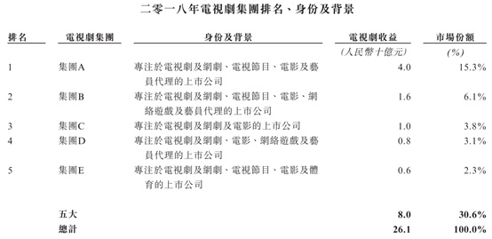 作品产出明显有限的新石文化,现阶段有着高度大客户依赖属性。招股说明书数据显示,截至2016-2018年度及2019年6月30日,五大客户分别占总收入的约91.9%、82.9%、84.2%及93.5%,最大客户分别占总收入约37.8%、24.5%、39.5%及37.4%。而这份基本由大客户贡献的营收,按2018年市场规模记,仅占到市场份额的0.6%的公司排到行业20位之后,面对五大电视剧集团合共占30.6%市场份额的行业竞争中而言,基本没有任何规模优势可言。
