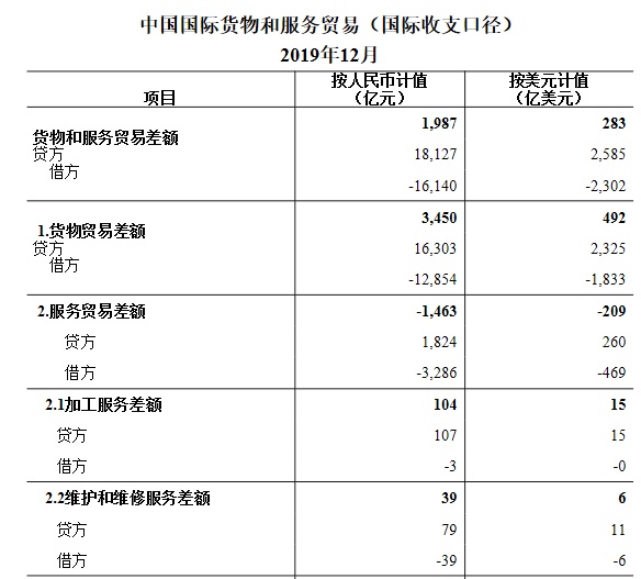 智通财经APP获悉,2月3日,国家外汇管理局公布2019年12月我国国际货物和服务贸易数据,具体如下: