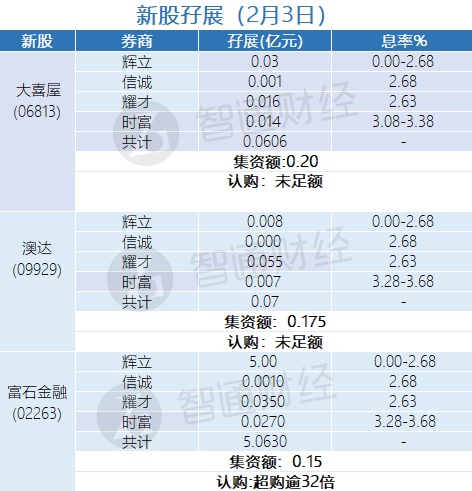 智通财经APP获悉,1月31日,大喜屋(06813)、澳达(09929)、富石金融(02263)正在招股中。其中富石金融超购逾32倍,大喜屋和澳达认购未足额。