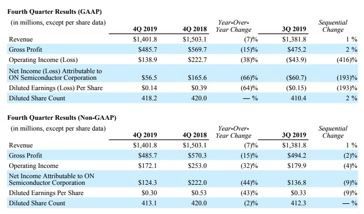 智通财经APP获悉,2月3号美股盘前安森美半导体(ON.US)发布2019年四季度和全年财报,报告显示公司四季度非GAAP下每股盈利0.3美元,同比下滑43%。GAAP下每股收益为0.14美元,同比下滑64%。低于市场预期。Q4营收14亿美元,同比下降6.7%,环比增长约1%,高于市场预期。