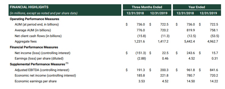 截止至2019年12月31日,AMG的资产管理规模达7225亿美元,低于去年同期的7360亿美元。同时,AMG在2019年向股东返还了4.26亿美元,包括第四季度回购的1.1亿美元。