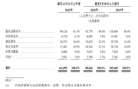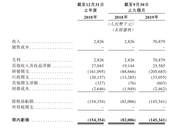 于往绩记录期,企业收入主要包括与外授权产品有关的预付款及里程碑付款。于2018年,企业取得收入人民币283万元。截至2018年及2019年前九个月,我们分别录得收入人民币283万元及人民币7088万元。