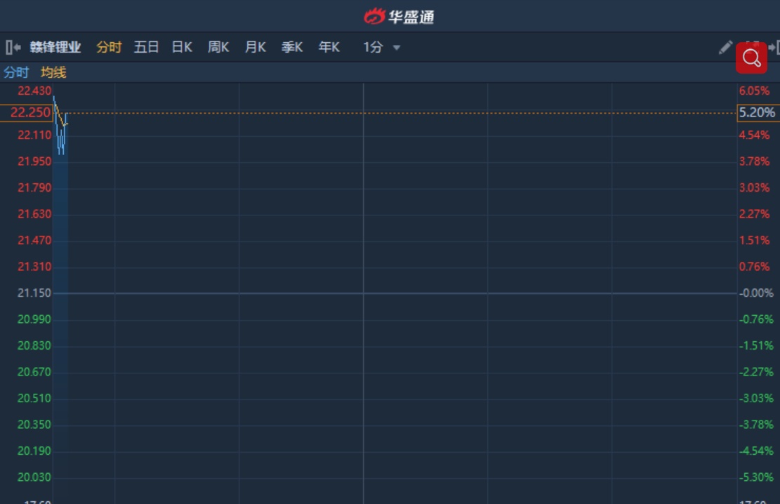智通财经APP获悉,隔夜美股特斯拉(TSLA.US)暴涨近20%,赣锋锂业(01772)早盘跳空高开,截至9时36分,涨5.2%,报价22.25港元,成交额1143万。