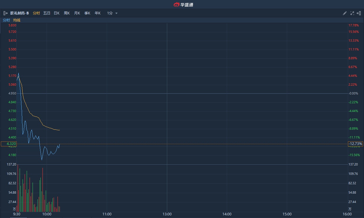 智通财经APP获悉,歌礼制药-B(01672)昨日发布公告,公司已收到相关医疗机构和研究人员申请使用公司研发的ASC09复方片和利托那韦 开展新型冠状病毒感染患者临床试验,当日一度涨逾四成,最终收涨19%。今日早盘急跌逾15%,截至发稿,跌13.13%,报4.3港元,成交额1.06亿港元。
