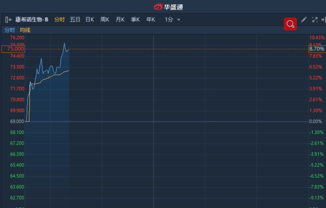 智通财经APP获悉,康希诺生物-B(06185)早盘再获资金追捧,盘中急升逾9%高见75.5港元,续创历史新高,截至10时20分,涨8.7%,报价75港元,成交额2361万。