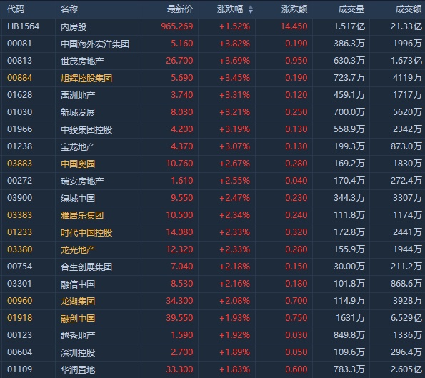 截至发稿,中国海外宏洋集团(00081)涨4.23%,报5.18港元;世茂涨3.69%,报26.7港元;旭辉涨3.45%,报5.69港元;时代中国涨2.47%,报14.1港元;融创涨2.06,报3.96港元;