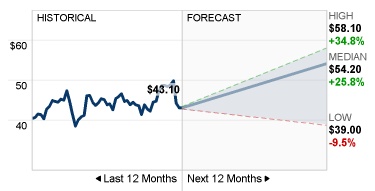股价方面,15位投资分析师普遍预计未来12个月内公司的股价预估中值目标为54.2美元,最高58.1美元,最低39美元。该预估中值较上一次的43.12美元上涨约25.7%。
