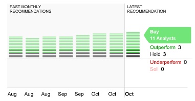 从评级来看,在接受调查的17位分析师中,有11位分析师给予公司“买入”评级,此外,有3位分析师给予“跑赢大市”评级,3位分析师给予“持有”评级。