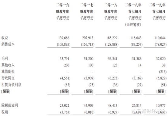 公司的所有收益均来自澳门。2016-2018财年内,公司的收益却呈现一波三折的走势,由2016财年的1.4亿澳门元迅猛增长至2017财年时2.08亿澳门元,随即又在2018财年时滑坡至1.85亿。然而,到了2019财年的首7个月内,收益再度较2018财年首七个月有所下滑。