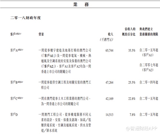 澳达控股的客户一般为澳门相关发展及翻新项目的总承建商或机电工程分包商。于2016-2018财政年度及2019年前7个月,五大客户为独立第三方,分别占其总收益约95.4%、99.7%、94.4%及93.0%。尤其值得注意的是,期内,客户A分别占公司总收益的约45.4%、70.8%、35.5%及34.8%,客户B分别占公司总收益的约33.8%、18.6%、25.5%及35.5%。