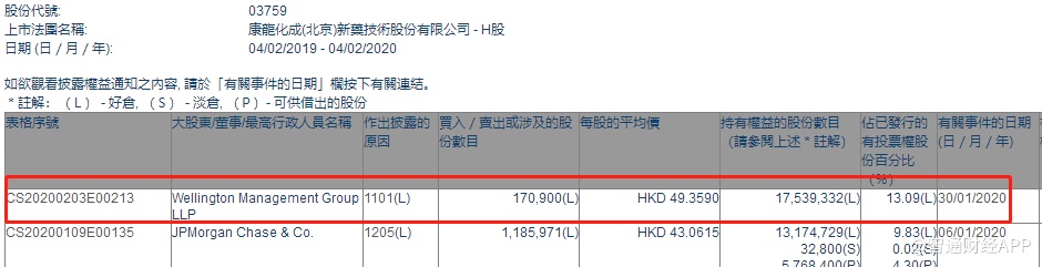 智通财经APP获悉,联交所最新资料显示,1月30日,Wellington Mgt Group增持康龙化成(03759)17.09万股,每股作价49.359港元,总金额约为843.55万港元。增持后最新持股数目约为1753.93万股,最新持股比例为13.09%。