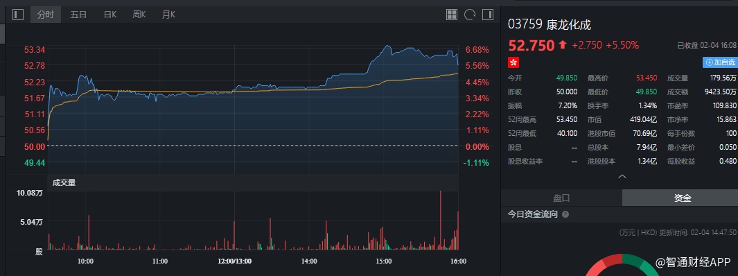 截至今日收盘,康龙化成(03759)涨5.50%,报52.75港元。