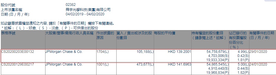 智通财经APP获悉,联交所最新资料显示,1月29日,摩根大通减持舜宇光学(02382)10.52万股,每股作价139.2001港元,涉及总金额约为1464.22万港元。减持后最新持股数目约为5475.87万股,最新持股比例为4.99%。