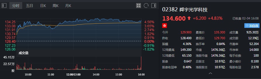 截至今日收盘,舜宇光学科技(02382)涨4.83%,报134.6港元。