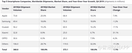 具体而言,2019年第四季度全球智能手机总出货量为3.688亿部,比上一季度增长2.9%,同比下滑1.1%。苹果、小米和OPPO实现了逆市的同比增长。从全年情况来看,2019年全球前四手机厂商仍被三星、华为、苹果、小米占据。
