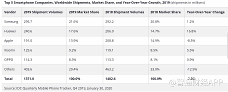 IDC研究指出,整体出货量下滑的部分原因在于中国市场出货量增长疲软,4G5G过渡期间市场观望心态较重,华为在2019年第三季度积累了较高的库存,加上国内竞争对手面临压力,导致第四季度中国国内增长放缓。