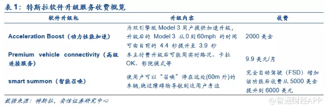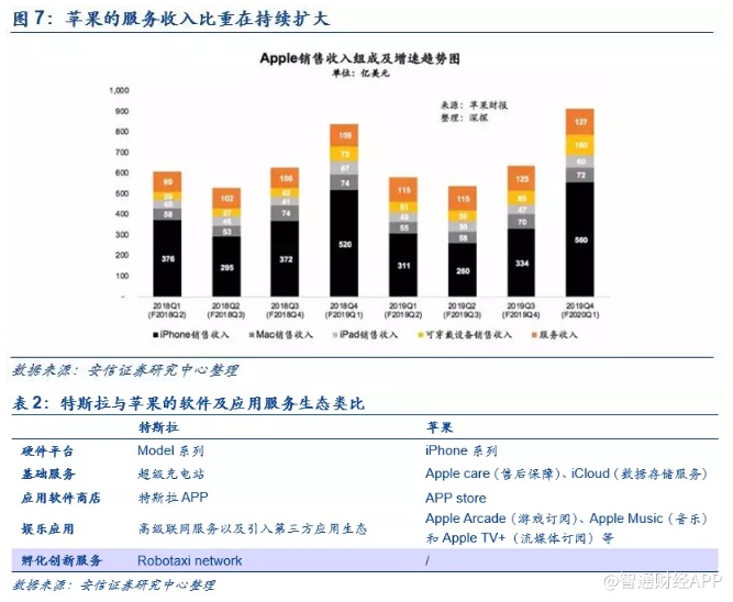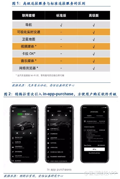 特斯拉2019年Q4季报透露出的重要信息——商业模式正在向苹果看齐。作为TMT研究员,通读特斯拉最新披露的2019年Q4报告,相对于产能和交付,我们更关心的是特斯拉软件收费的业务创新,具体包括:1)首次引入了软件应用商店(in-app-purchase),方便用户购买软件升级。未来所有特斯拉车主都可以在特斯拉的APP中购买各种软件更新服务,例如基本版自动辅助驾驶(Autopilot),完全自动驾驶(FSD),加速性能提升以及其他高端功能;2)首度开启高级连接服务收费(9.9美元/月)。只有车主支付了服务费才能用实时路况、卡拉OK、流媒体等功能。从上面两个业务创新中,我们可以看出,站在马斯克的视角,卖车只是开始,软件服务的持续收费才是其未来最重要的商业模式。在造好车的同时,特斯拉的软件服务生态正在逐步完善,商业模式也在向苹果的闭环生态看齐。可以说,未来的智能汽车同样会变成一个持续创造价值的智能平台,这也是所有主流车厂都认可的产业趋势。但目前来看,只有特斯拉真正迈出了第一步,做到了像智能手机一样持续为消费者创造价值,并从中持续受益。