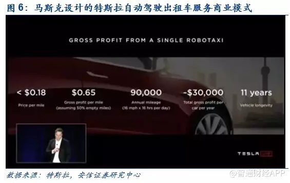 超越苹果,特斯拉的未来是自动驾驶服务出行平台。需要强调的是,特斯拉绝不止是把智能手机生态复制到了汽车产业,未来更值得期待的是自动驾驶成熟后带来的商业模式颠覆。根据马斯克在2019年特斯拉自动驾驶日(Autonomy Day)的阐述,特斯拉将在2020年实现完全自动驾驶功能,并开展自动驾驶出租车服务(Robotaxi network,可以理解为特斯拉打造的无人驾驶网约车平台)。具体而言,特斯拉车主可以选择加入Robotaxi network共享自己的特斯拉车辆,基于自动驾驶功能,共享的特斯拉车辆将类似Uber一样提供无人驾驶的出租车服务。根据马斯克的测算,加入特斯拉Robotaxi network的车主潜在的毛利润大概在单车3万美元/年,而对于特斯拉而言,将从乘车费用中收取25-30%作为平台运营收入。尽管2020年实现完全无人驾驶的目标在业内尚存在争议;但无可争议的是,一旦自动驾驶技术完全成熟,势必将打破现有的汽车产业商业模式(制造—销售),我们坚定看好特斯拉成为产业变革的引领者。