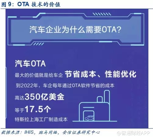 整车OTA升级是特斯拉持续进化的“武功绝学”,也是软件服务收费的基石。简单的讲,整车OTA技术(over the air空中升级),就是能够让汽车像手机一样实现系统空中在线升级。需要强调的是,本文强调的是整车级别的OTA技术,不仅仅是简单的娱乐系统的OTA,而是可以延伸到更深层次的汽车控制系统、电池管理系统等核心领域,从而提升汽车的性能,比如前文所述特斯拉的Acceleration Boost(动力性能加速)就是典型的整车OTA案例。从本质上来说,整车OTA对于汽车厂商的价值在于两方面,一方面是性能升级,一方面是节省成本(通过OTA升级修改BUG,可以大大降低汽车厂商召回成本)。根据IHS的预测,仅节省成本而言,OTA在2022年可以为全球整车厂节省350亿美金。特斯拉是全球第一个使用整车OTA技术的车厂,其软件以及应用服务生态的更新迭代依赖于整车OTA技术(over the air空中升级),从而实现对已售车辆的持续升级。可以说,整车OTA技术是特斯拉从“钢铁”升级到“钢铁侠”的关键,也是特斯拉实现软件服务收费的技术基石。