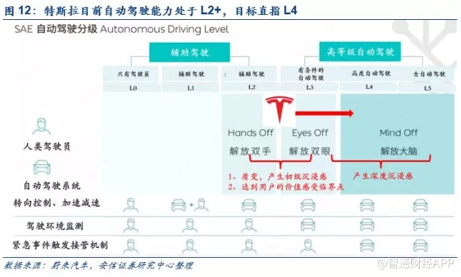 特斯拉是全球自动驾驶技术商业化的标杆。从2014年发布首版自动驾驶系统“Autopilot”以来,特斯拉一直是全球自动驾驶技术商业化的标杆,也被业界公认为自动驾驶能力最领先的车厂。参考国际上通用的美国SAE协会定义的自动驾驶分级标准,特斯拉目前的自动驾驶系统处于L2+状态,目标直指L4。根据马斯克在2019年特斯拉自动驾驶日(Autonomy Day)的阐述,特斯拉将在2020年实现完全自动驾驶功能(L4)。一旦特斯拉的完全自动驾驶技术成熟,Autopilot系统将从“机器辅助人开车”(L2)升级到“完全机器开车”(L4),其对消费者的应用价值将指数级上升。