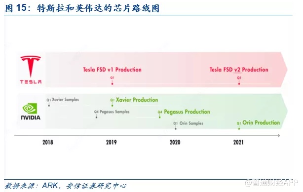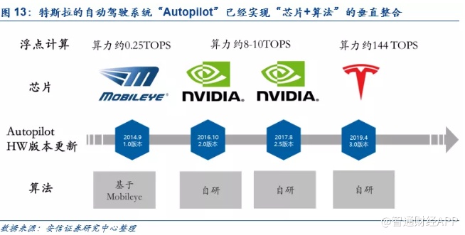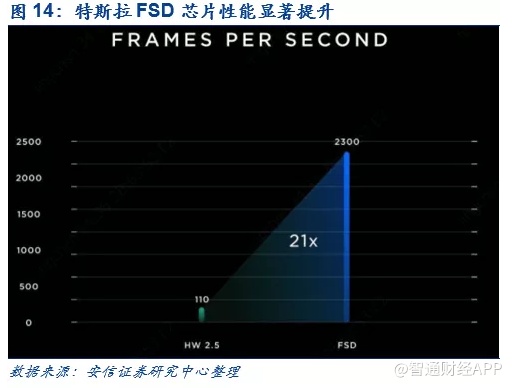 特斯拉自动驾驶的独门秘籍之一:完全自研的自动驾驶芯片+算法。从2014年推出第一个版本开始,特斯拉的自动驾驶系统“Autopilot”系统经过了4次大的硬件版本更新,从最初1.0版本的完全基于第三方供应商Mobileye提供芯片+算法,到2.0、2.5版本逐步过渡到自研算法+英伟达的芯片,最后在2019年4月份特斯拉成功推出自研芯片,实现了自动驾驶芯片+算法的垂直整合。从实际效果来看,基于自研的自动驾驶芯片的Autopilot系统性能得到了显著提升,从2.5版本只能同时处理每秒110帧图像进化到3.0版本同时处理每秒2,300帧的图像;与此同时,芯片成本也较之前下降了20%。如同苹果在智能手机的成功一般,特斯拉自动驾驶技术的垂直整合之道再次证明一个道理——依赖第三方供应商技术无法建立起持续的核心业务壁垒,关键技术必须自研。以芯片为例,特斯拉的自研FSD芯片被马斯克称为世界上最好的自动驾驶芯片,国内自动驾驶芯片厂商地平线的战略规划副总裁李星宇就表示:“特斯拉自研芯片成功,成为业内唯一一家拥有了自己芯片的车厂,这将打破产业游戏规则。从技术角度看,FSD的成功推出足以令其领先同行至少三年”。