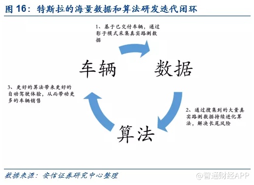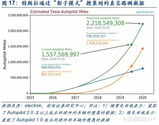 特斯拉自动驾驶的独门秘籍之二:打造海量数据+算法的研发迭代闭环。目前自动驾驶算法的一大挑战在于——现实世界中,各式各样的复杂且少见的驾驶场景所带来的长尾风险。对于这个挑战,特斯拉的方法论是通过打造海量数据+算法的研发闭环,解决现实世界中可能存在的0.00…01%的长尾风险。相对于其他自动驾驶厂商而言,特斯拉的最大优势在于拥有持续搜集海量真实数据的能力——特斯拉已交付车辆全部前装了“Autopilot”的硬件(包括摄像头、毫米波雷达等传感器),这些车辆实际上就变成了特斯拉源源不断的在线传感器,为其提供路测数据。根据electrek的分析,截至2019年7月,特斯拉已交付超64.3万辆具有自动驾驶功能的特斯拉汽车,基于上述车辆采集到的自动驾驶路测里程达15.6亿英里。与之对比,业内公认的自动驾驶全球领军企业——谷歌 Waymo也只不过有1500万英里的数据积累。