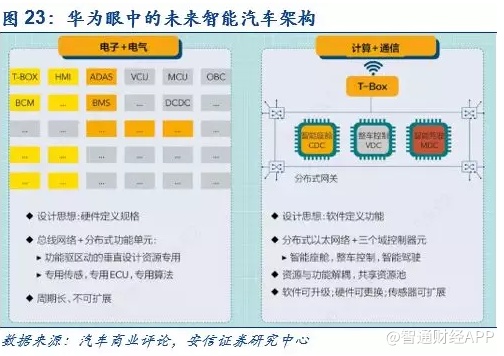 以华为为代表的面向智能汽车的新一代供应商正在崛起。与德尔福科技这类传统Tier 1相对应的是,以华为为代表的面向智能汽车的Tier 1正在崛起。回顾2019年,如果要评选智能汽车产业最重磅的十大事件,华为的进入无疑是重要的候选。2019年4月份的上海车展,华为正式宣布进入汽车领域,目标是世界级的Tier 1;随后5月27日,任正非,华为组织变动文件,批准成立智能汽车解决方案BU,并再次明晰战略定位——面向智能网联汽车的“增量部件供应商”。根据华为轮值董事徐直军的阐述,华为认为未来走向完全自动驾驶、电动汽车以后,车的价值构成中60%-70%和电子、计算、通信、软件相关,传统部件只占30%-40%。所以,华为不去做传统Tier 1涉及的传统机械部分,做的是适应智能网联汽车的需求的“增量部件”。对于未来汽车的发展趋势,华为也给出了自己的解读,华为认为:不同于传统汽车,智能网联电动汽车将成为持续价值创造的平台。而让汽车从机械部件升级为智能平台的关键在于:“一个架构,三个平台”。其中,架构是指汽车的电子电气架构要从目前分散式架构升级为“计算+通信”,只有架构更新才能让汽车有了软件定义并持续创造价值的可能,三个平台指的是MDC智能驾驶平台、CDC智能座舱平台和VDC智能电动平台。华为智能汽车的解决方案与特斯拉可谓“英雄所见略同”。百年汽车工业的iPhone时代已由特斯拉开启,我们看好以华为为代表的新势力快速崛起,这将是新的跨时代的机遇。