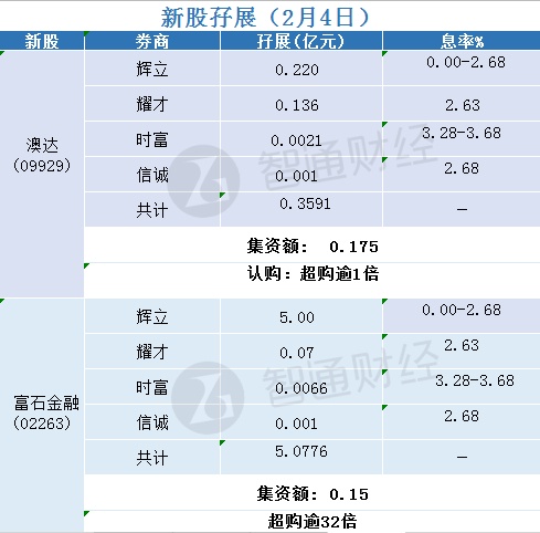 智通财经APP获悉,2月4日,澳达(09929)、富石金融(02263)正在招股中。其中澳达超购逾1倍,富石金融超购逾32倍。