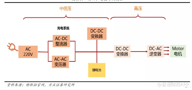新能源汽车由于不再需要发动机等机械部件,汽车的结构将变得非常的简单,汽车结构主要由电池,电机和电控组成。新能源汽车电子系统主要包括电池管理系统,电机控制器,车载充电机,变换器,逆变器,转向系统,继电器以及被动元器件。在实际应用场景中,由于汽车各个模块都使用交流电,锂电池的输入电流是直流电,以及各种电气设备电压不同,这样就需要相应的电力转换系统。根据直流(DC)和交流(AC)转换顺序不同,电力转换分为4种模式:变压器(AC-AC)、整流器(AC-DC)、变换器(DC-DC)和逆变器(DC-AC)。
