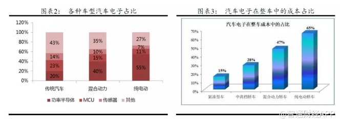 汽车电子在汽车中占据着十分重要的地位,从成本结构来看,对于中高端汽车、电动汽车等其重要性更高。从传统汽车转变到新能源汽车,价值量增长最大的就是功率半导体。传统燃油汽车中,功率半导体主要用在启动、停止和安全等领域,占比只有20%,按照传统汽车中半导体单车价值350美元,功率器件价值在70美元。新能源汽车电池动力模块要用大量的电力设备,电力设备中都含有有功率半导体,混合动力汽车的功率器件占比40%,纯电动汽车的功率器件占比55%,按照纯电动汽车半导体单车价值750美元计算,功率半导体单车价值量在413美元。新能源汽车用功率半导体是传统汽车的7倍。